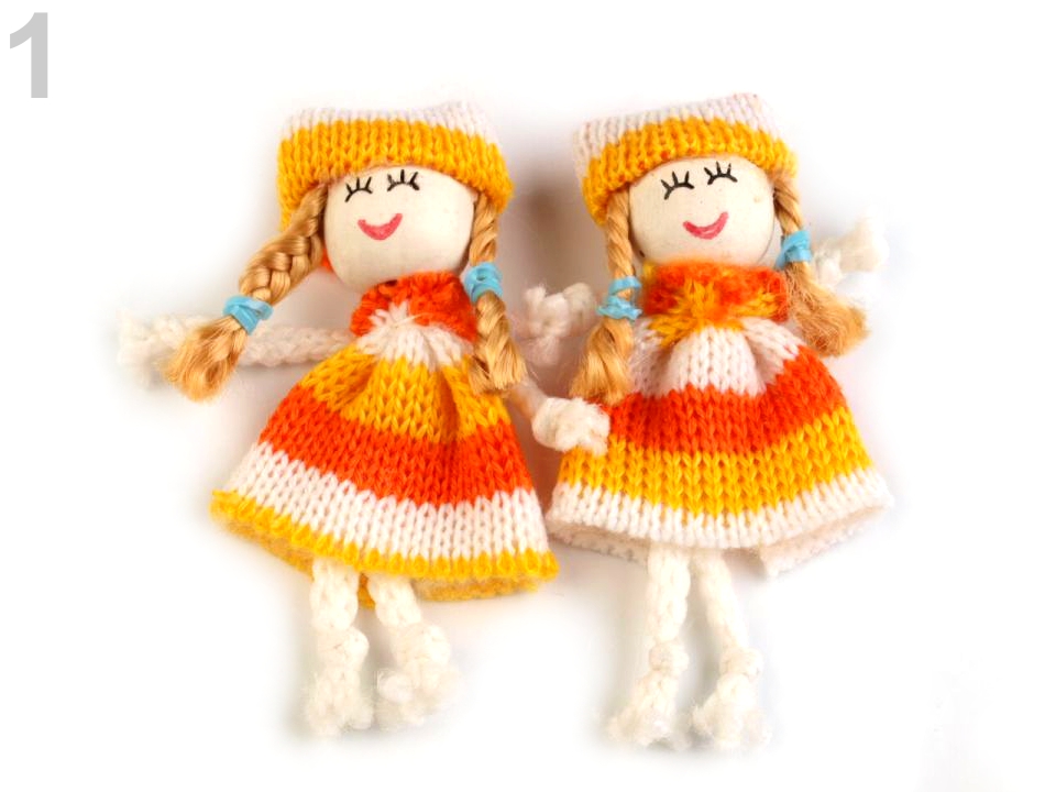 Zierliche Stoffpuppe mit Kopf aus Holz und Körper aus Polyester. Mit gestreiftem Kleid und gestreifter Mütze, unter der die Zöpfe geflochten sind.