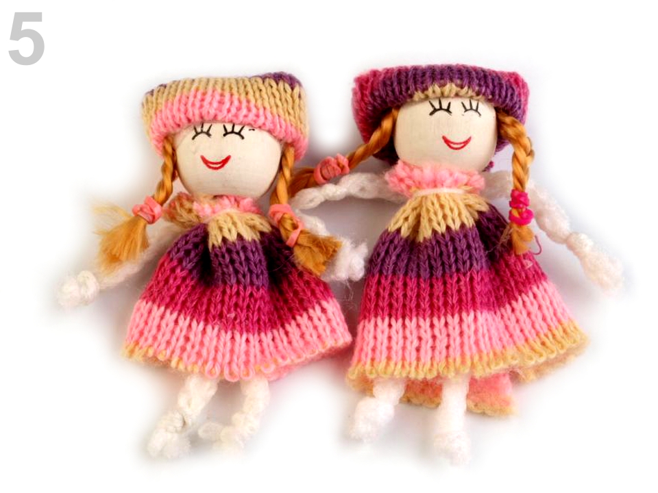 Zierliche Stoffpuppe mit Kopf aus Holz und Körper aus Polyester. Mit gestreiftem Kleid und gestreifter Mütze, unter der die Zöpfe geflochten sind.