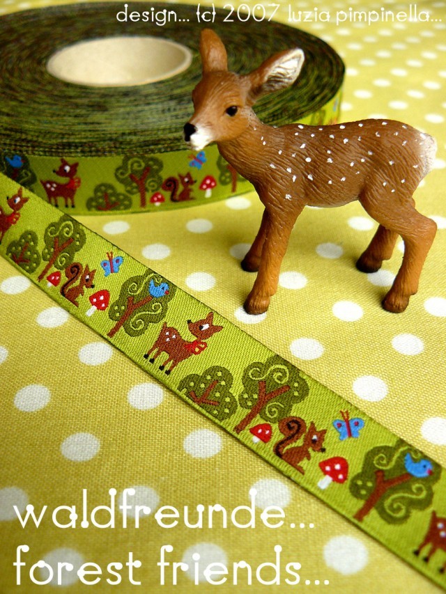 Webband mit Rehlein, Eichhörnchen, Schmetterling, Vögelein und Fliegenpilzen