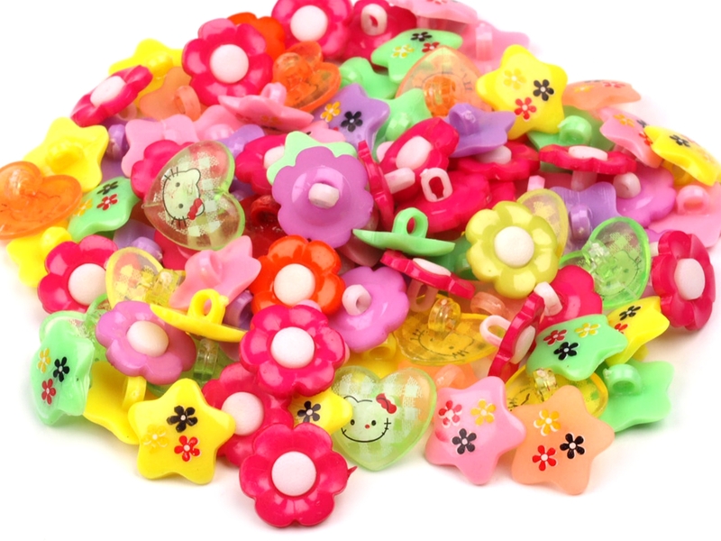 Die Knöpfe werden in einem Mix von verschiedenen Farben und Motiven geliefert. Ideales Zubehör für Kinderbekleidung.