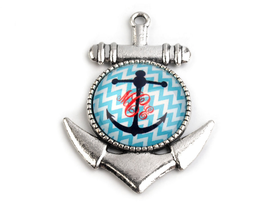 Markanter Anker-Anhänger aus Metall hat drinnen transparenten Cabochon und ist weiter mit Matrosenmotiv bedruckt. Der Cabochon hat Form einer bauchigen Linse. Um ihn herum gibt es Zierrand, sein Durchmesser ist 20 mm.