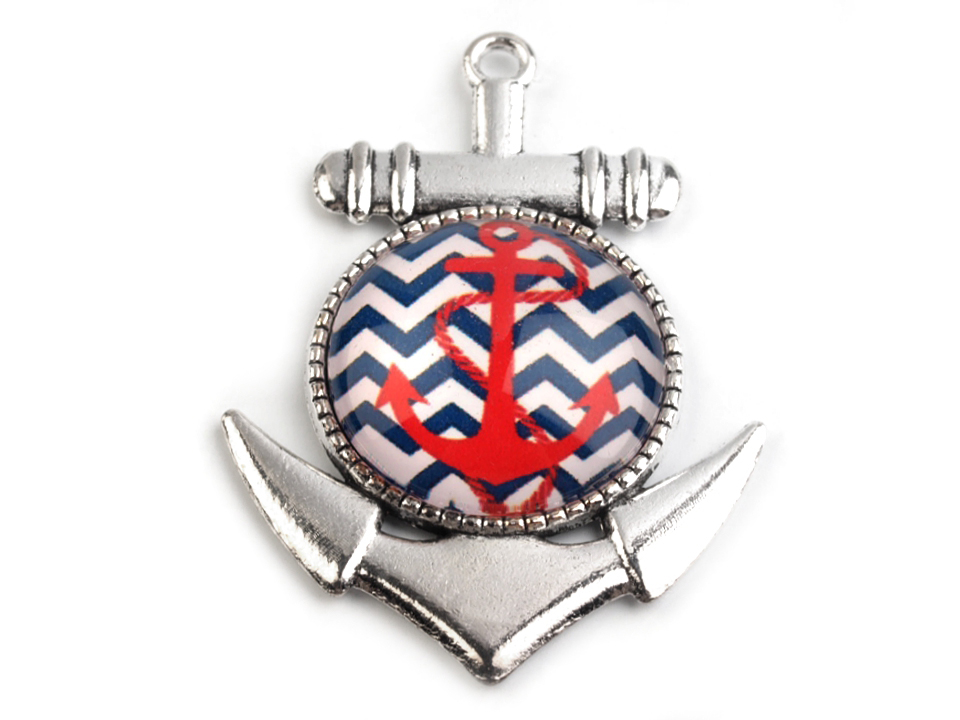 Markanter Anker-Anhänger aus Metall hat drinnen transparenten Cabochon und ist weiter mit Matrosenmotiv bedruckt. Der Cabochon hat Form einer bauchigen Linse. Um ihn herum gibt es Zierrand, sein Durchmesser ist 20 mm.