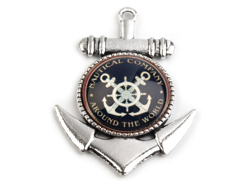 Markanter Anker-Anhänger aus Metall hat drinnen transparenten Cabochon und ist weiter mit Matrosenmotiv bedruckt. Der Cabochon hat Form einer bauchigen Linse. Um ihn herum gibt es Zierrand, sein Durchmesser ist 20 mm.