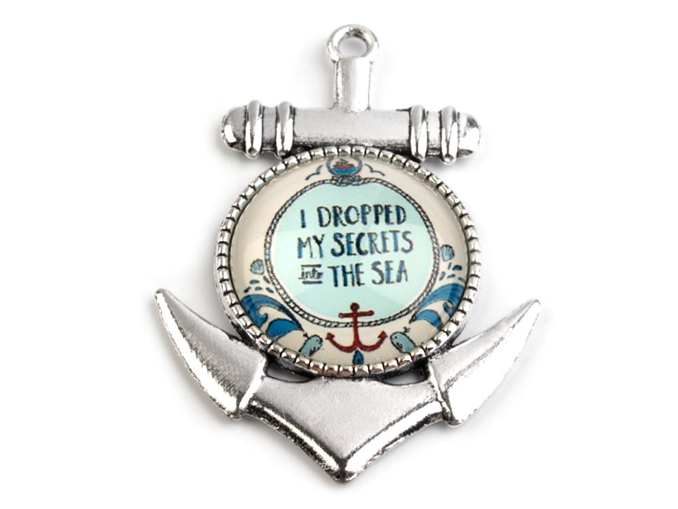 Markanter Anker-Anhänger aus Metall hat drinnen transparenten Cabochon und ist weiter mit Matrosenmotiv bedruckt. Der Cabochon hat Form einer bauchigen Linse. Um ihn herum gibt es Zierrand, sein Durchmesser ist 20 mm.