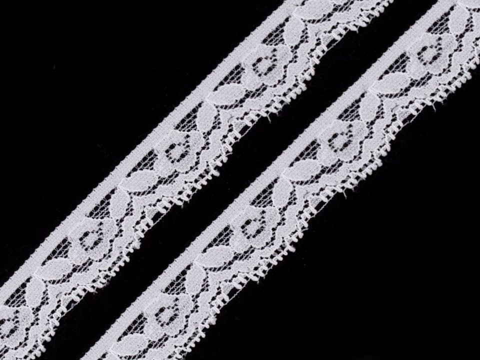 Elastische Spitzeborte aus Polyamid mit Elasthan. Breite 20 mm. Geeignet als Verzierung für Unterwäsche, Tops, Blusen oder für