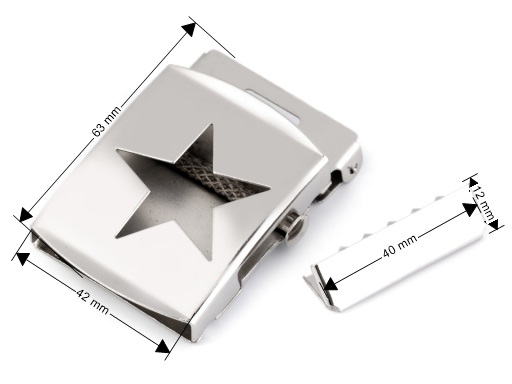 Gürtelschnalle aus Metall mit Endstück benutzt man bei Herstellung von Gürteln aus Gurtbändern. Die Vorderseite ist mit Stern verziert. Die Schnalle ist an einer Seite mit Zähnchen versehen, die das Gurtband gut fixieren. Das Endstück ist mit Zange zum Ende des Gurtbandes zu befestigen.